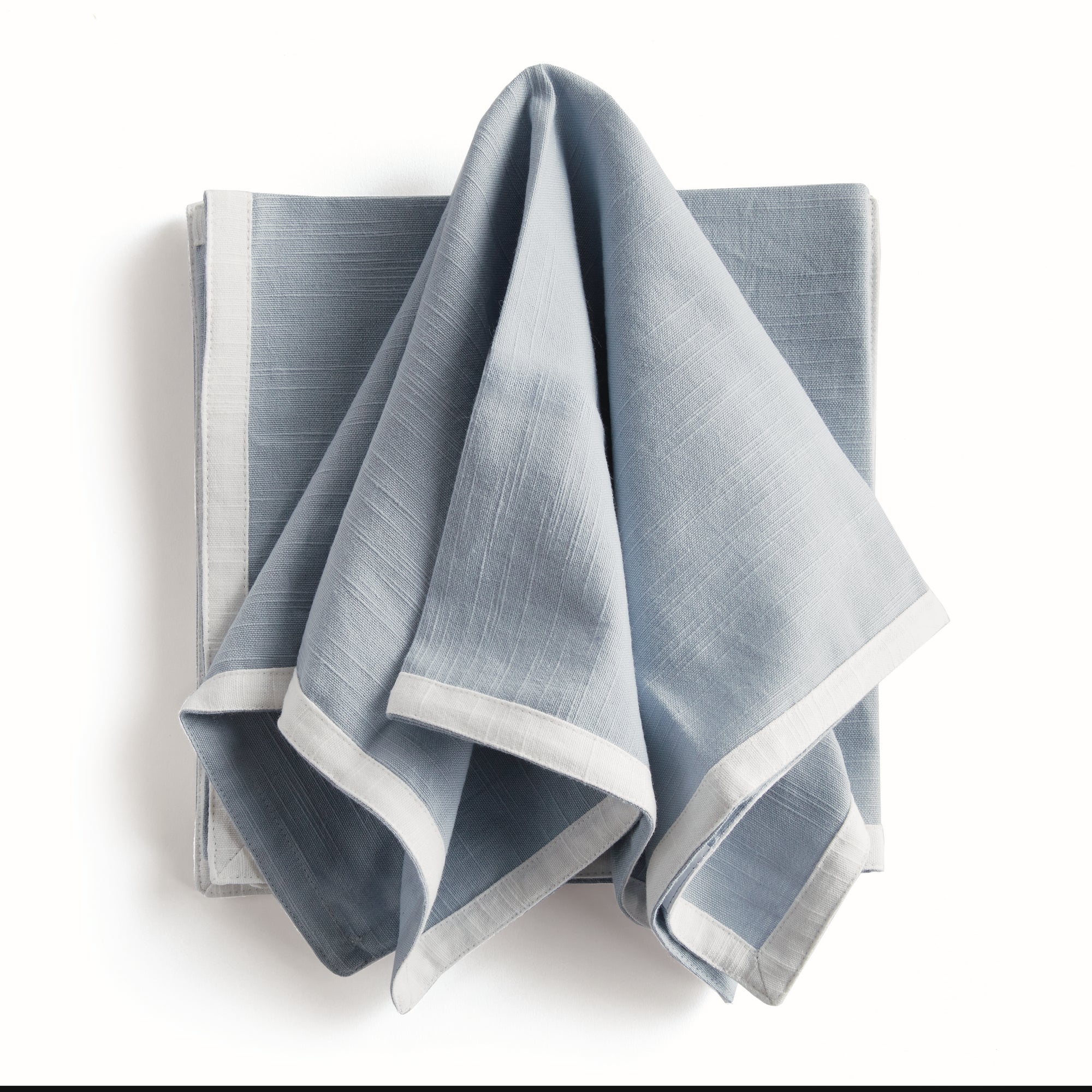 Bring a touch of softness to the table with this set of four 100% woven cotton napkins. Beautiful in tone and texture, the white & blue combination is made to add a pop of color to any tablescape.