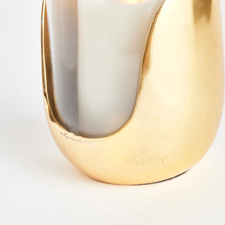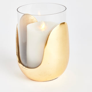 In a marriage of thoughtful design and mixed materials, this stunning hurricane features hand blown glass that slides into a cast aluminum abstract base in a warm champagne. A truly unique contemporary accent for side table, console or mantel.