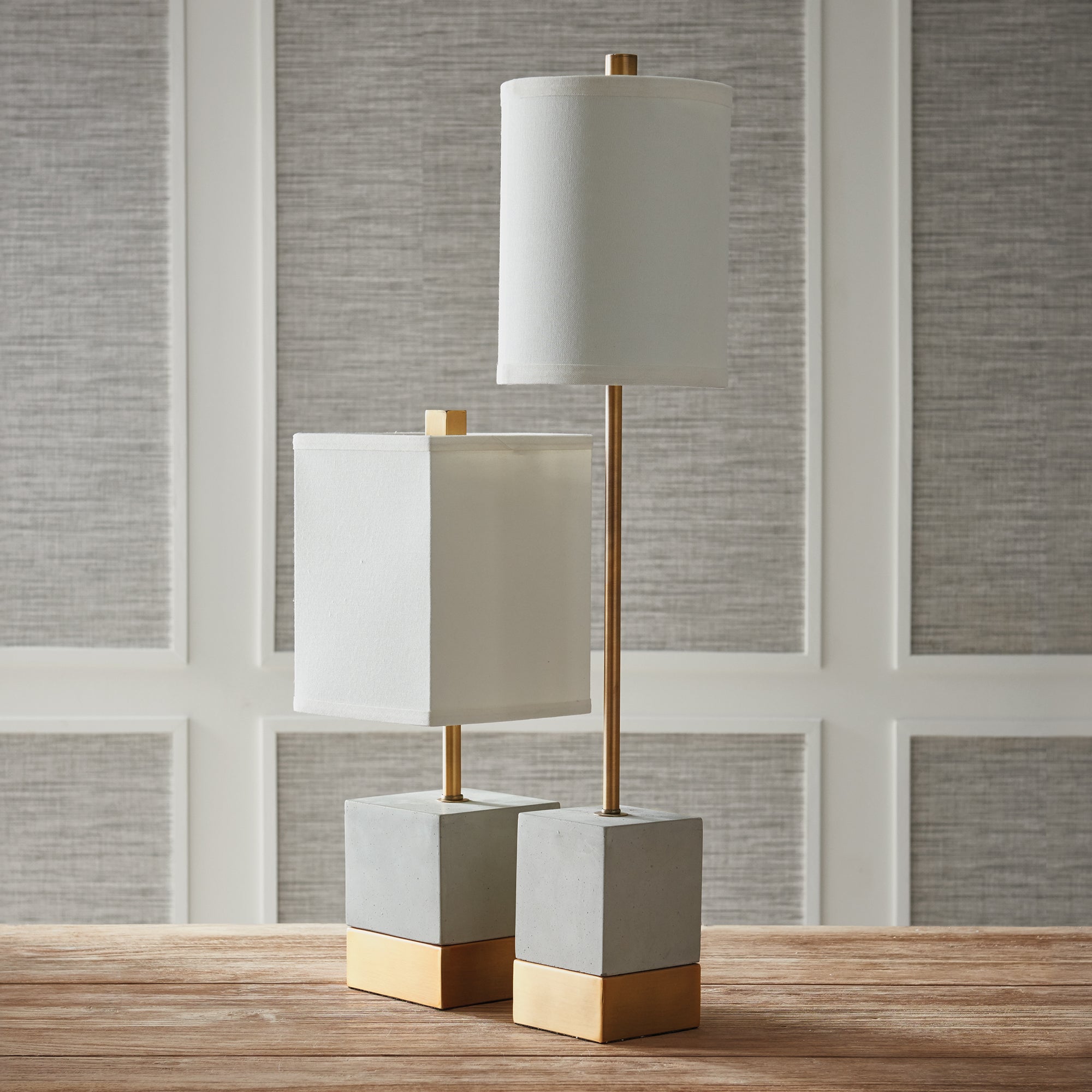 An unexpected mix of cement and brass accents make this lamp a stand out piece. The tall, narrow base and tailored shade are well-designed details not to be missed.